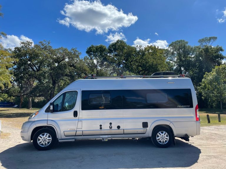 Spacious RV sleeping up to 5 with full kitchen, shower, and multi-way fridge. Easy to transport thanks to its lowering roof design.